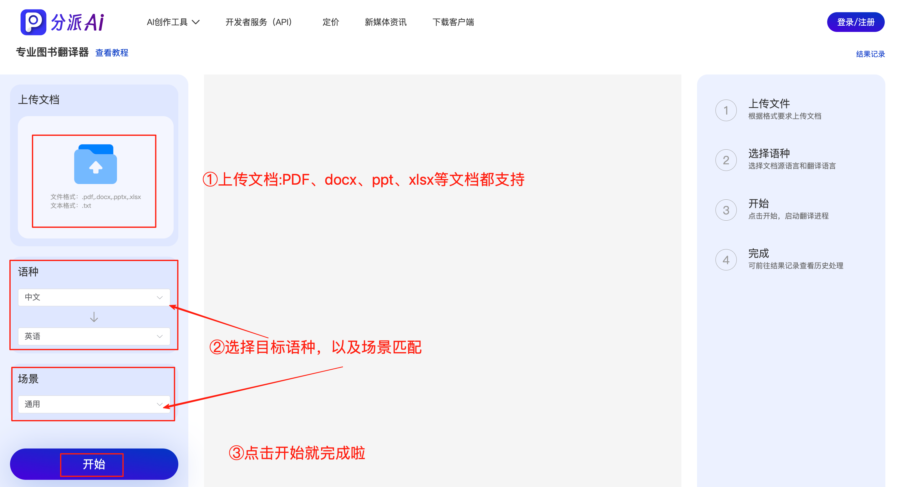 在 “文档翻译” 页面点击 “上传文件” 按钮,从电脑中选择需要翻译的 Word 文档(支持.doc 和.docx.pptx. 多种常见格式),等待文件上传完成。