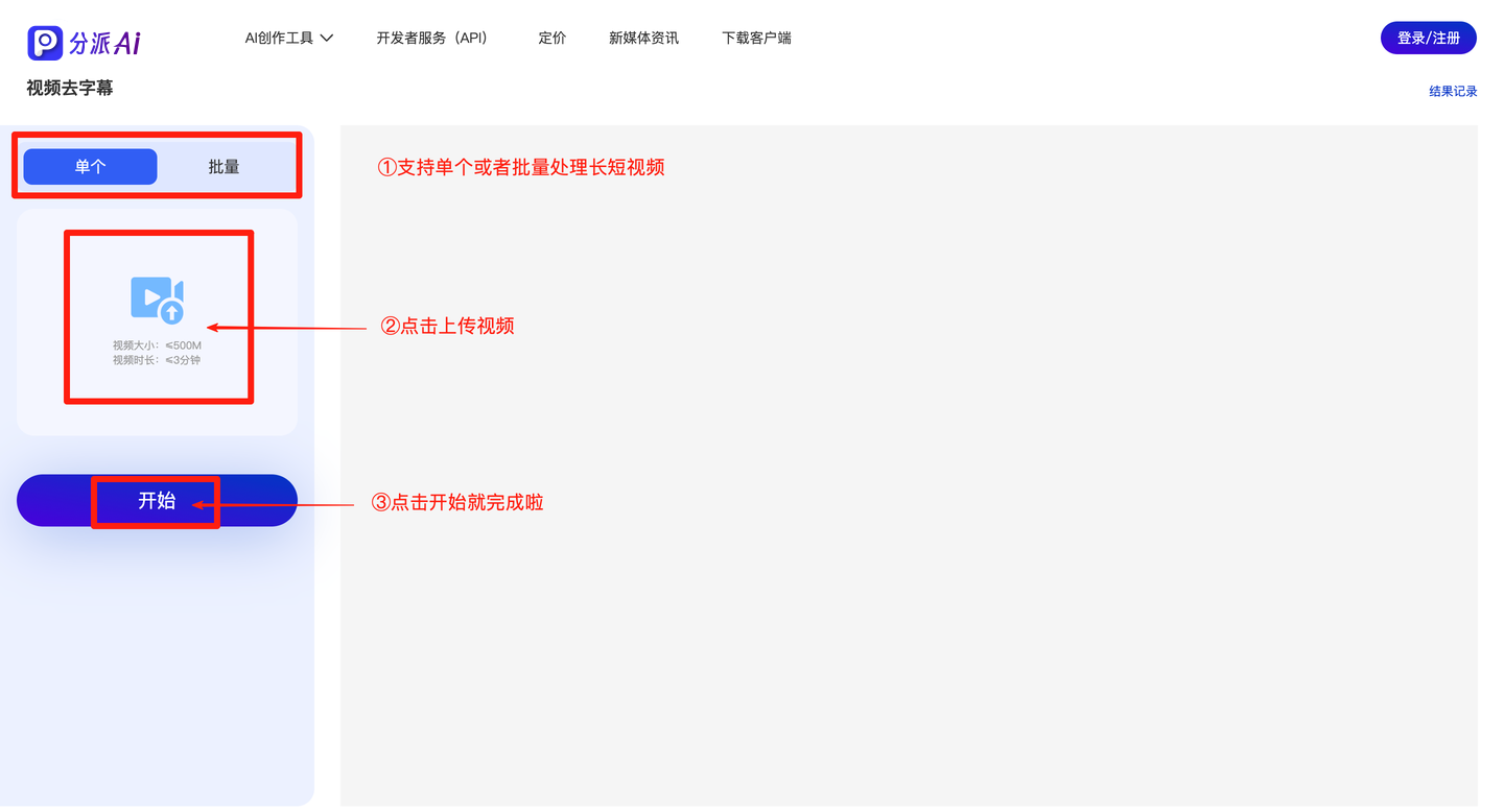 分派Ai是一款集成视频处理和AI修复的综合工具,其字幕去除功能基于多模态识别算法,不仅能去除硬字幕,还支持对去除后的画面进行降噪和色彩优化。