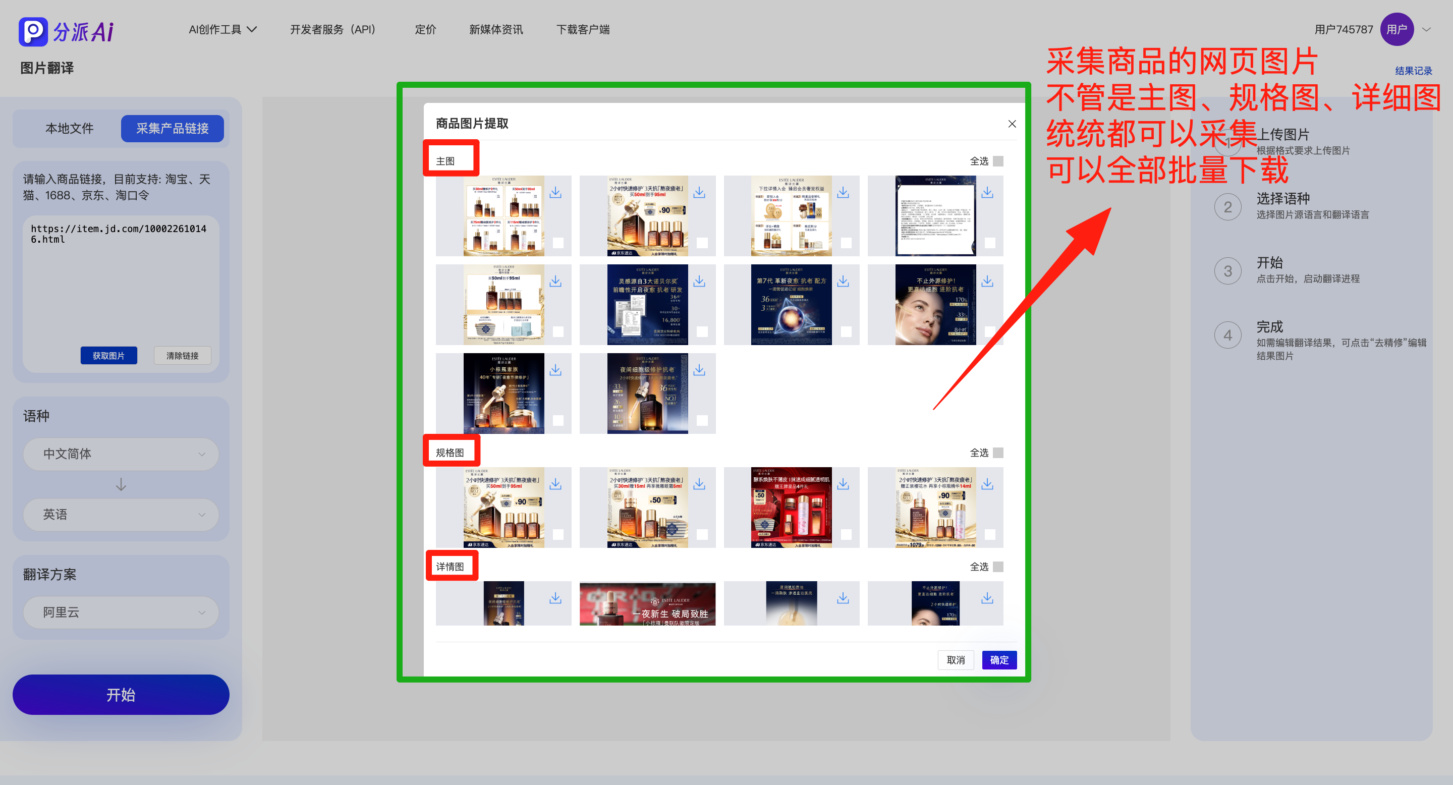 2.点击 “获取图片”,分派Ai会自动抓取商品的所有图 —— 不管是展示外观的主图、介绍参数的规格图,还是讲细节的详情图(比如印着成分说明的美妆瓶身图、标着参数的数码详情图),全都能 “批量打包” 采集到~