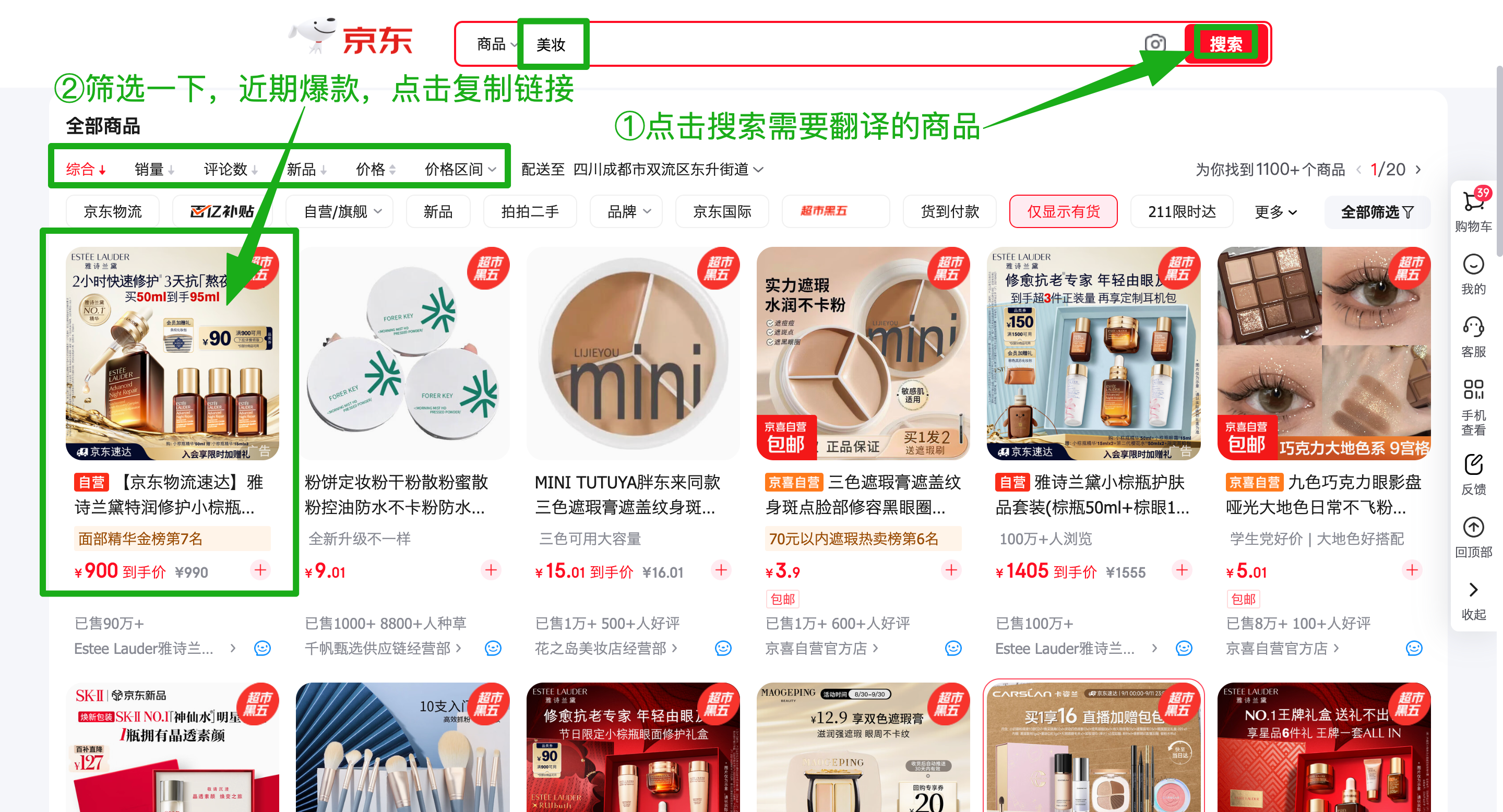 2.结果里挑中想翻译的商品(比如爆款雅诗兰黛小棕瓶),点进商品详情页;